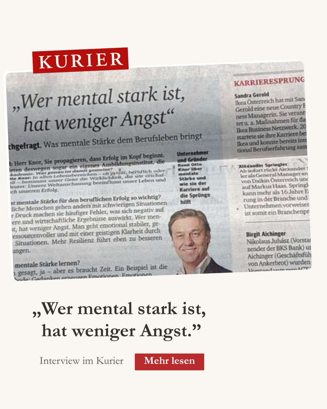 René Otto Knor am 15.03.2025 im Kurier über mentale Stärke und was sie im Berufsleben bringt. Hier den ganzen Artikel lesen.
